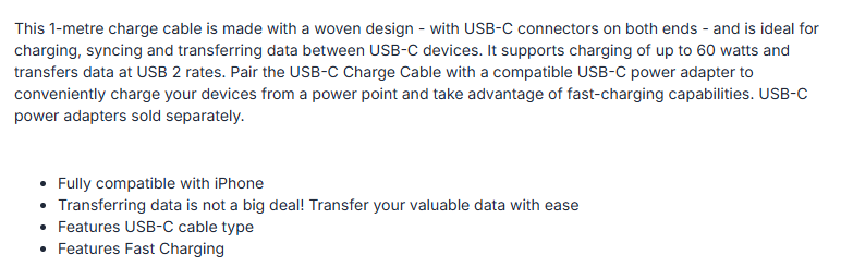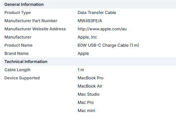 Overview Reviews Product Description Details Specifications Product Videos Custom Field Product Reviews (No reviews yet) Write a Review Write a Review × Apple Apple MW493FE/A, 60W USB-C Charging Cable, 1m, 1 Year Warranty Rating * Select Rating 1 star (worst) 2 stars 3 stars (average) 4 stars 5 stars (best) Name *Email *Review Subject *Comments