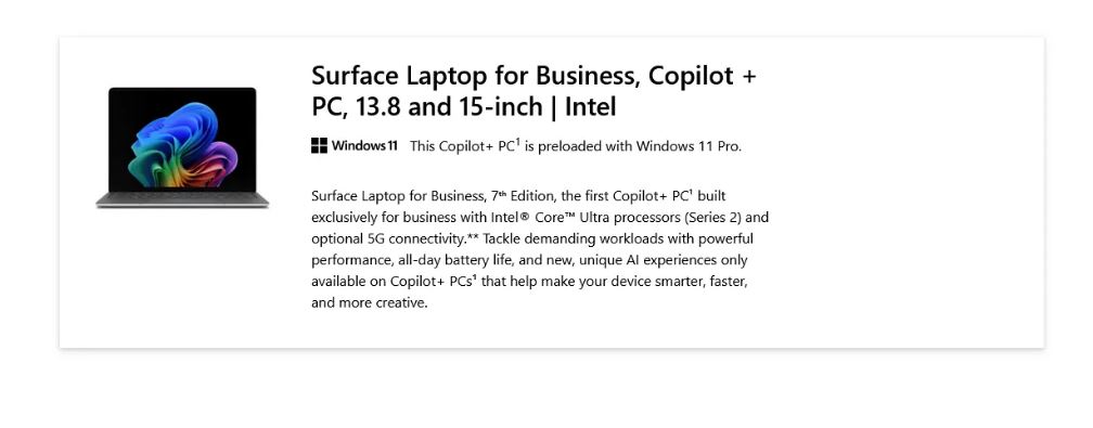 Microsoft Surface Laptop 7 15' TOUCH Intel Core Ultra 7 16GB 512GB SSD WIN 11 PRO Intel Arc Graphics AI USB-C TB WIFI7 BT Platinum 2yr wty PlatinumOperating System: Windows 11 PRO Screen Size: 15' Display Type: PixelSense Display Resolution: 2496 x 1664 Touch Screen: Yes Processor Model: Intel Core Ultra 7 RAM Size: 16GB Storage Size: 512GB Storage Type: SSD Graphics Brand: Intel Arc Graphics Input/Output: 1x Surface Connect port USB-C Port: 1x USB-A 3.1/1x USB-C Webcam: 720p HD front facing camera Wi-Fi: Wi-Fi 7 Bluetooth: 5.4 Battery Life: Up to 17 hours of typical device usage Colour: Platinum Weight (kg): 1.542 Product Height (mm): 14.7 Product Width (mm): 339.5 Product Depth (mm): 244 Manufacturer's Warranty: 2 Year