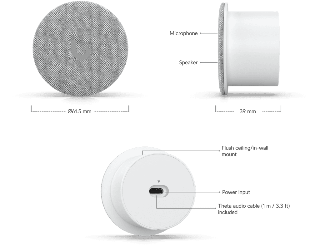Ubiquiti AI Theta Audio SKU: UVC-AI-Theta-Audio Tech Specs: Click Here Installation Guide: Click Here Description: Plug-and-play high performance 2-way audio module for AI Theta (NHU-UVC-AI-THETA). Features: •Two-way audio module that connects to an AI Theta Hub. •Built-in microphone and speaker for two-way audio •Connects to an AI Theta Hub with the included cable •Includes flush mount for flat ceiling or wall mounting •Includes 2 Year Warranty